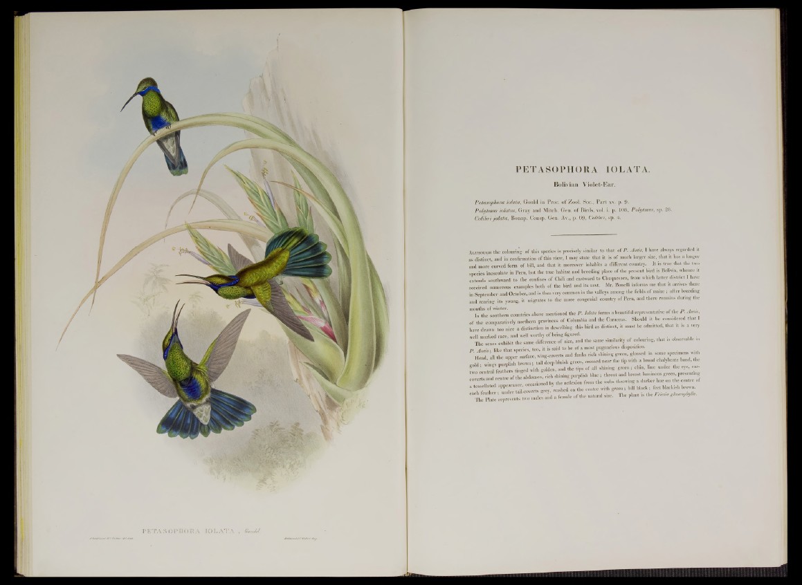 fw o c e n J feathers tinged with golden, and the tips of all shining green ; chin line under the eye, g g Hi centre of the abdomen, rich shining purplish blue ¡ throat and breast luminous green, presenting