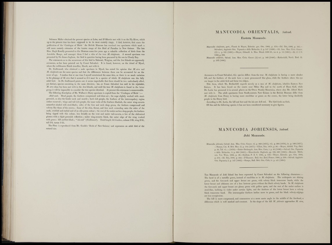 THE Manucode of Jobi Island has been separated by Count Salvadori on the following characters :—