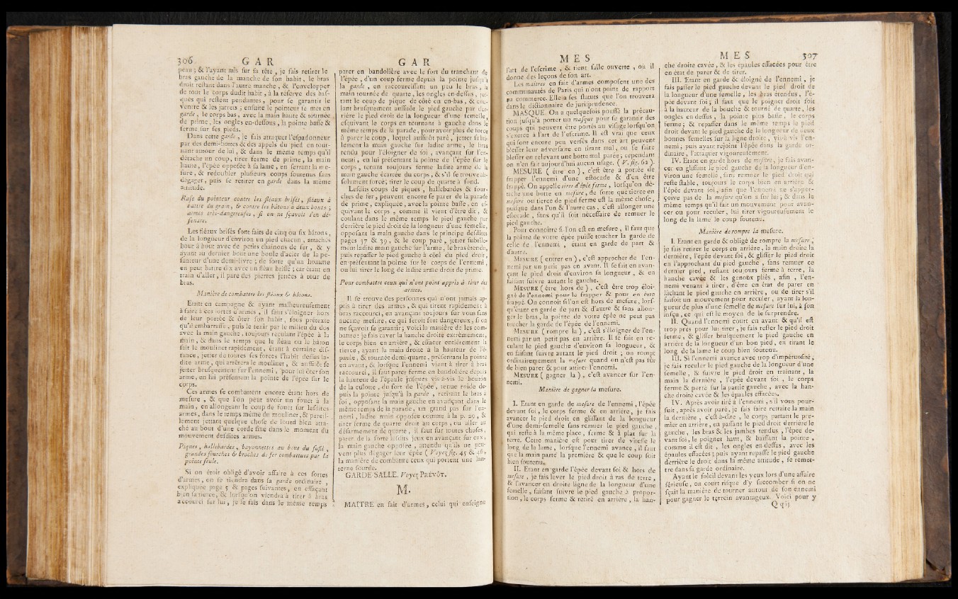 { . Mesure ( entrer en ) , c’ eft approcher de l’en- I nemi par un petit pas en avant. Il fe fait en avan- I çant le pied droit d’environ fa longueur , & en
